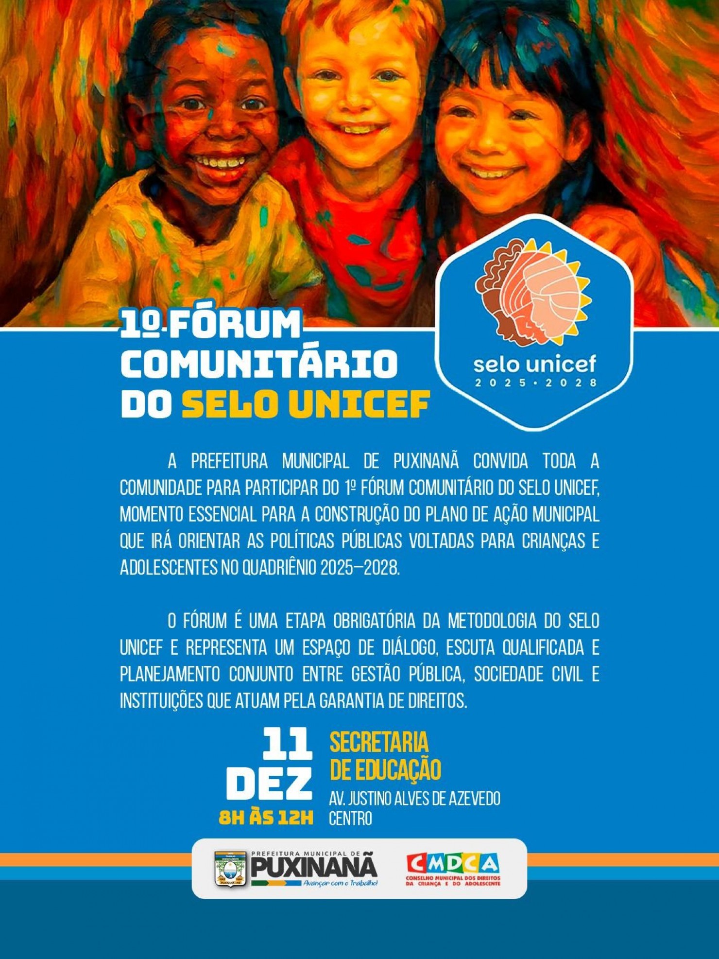 A Prefeitura Municipal de Puxinanã realizará, nessa próxima quinta-feira (11), o 1º Fórum Comunitário do Selo Unicef, um momento fundamental para construir, de forma coletiva, o Plano de Ação Municipal que irá orientar as políticas públicas destinadas a crianças e adolescentes no período de 2025 a 2028.