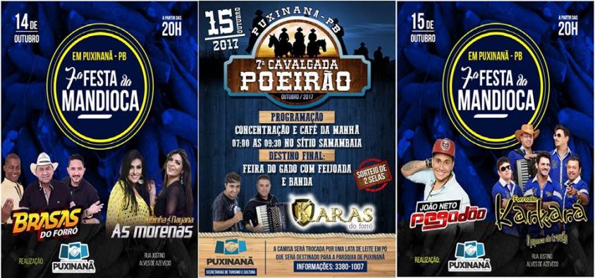 A PREFEITURA MUNICIPAL DE PUXINANÃ, ATRAVÉS DAS SECRETARIAS DE TURISMO E CULTURA, TRAZEM DE VOLTA A PUXINANÃ A TRADICIONAL FESTA DA MANDIOCA, O EVENTO SERÁ REALIZADO NOS DIAS 13,14 E 15 DE OUTUBRO DE 2017 ONDE SERÁ REALIZADA A SUA 7ª EDIÇÃO, E JUNTO DELA TERÁ O VENTO DA 7ª CAVALGADA POEIRÃO, QUE ATRAIRÁ DIVERSOS CAVALHEIROS E AMAZONAS DE PUXINANÃ E CIDADES CIRCUNVIZINHAS, A CAVALGADA CONTARÁ COM SORTEIOS, CAFÉ DA MANHÃ, FEIJOADA E MUITA MUSICA AO VIVO AO SOM DOS KARAS DO FORRÓ, BANDA QUE ESTÁ NA PROGRAMAÇÃO DA 7ª FESTA DA MANDIOCA.