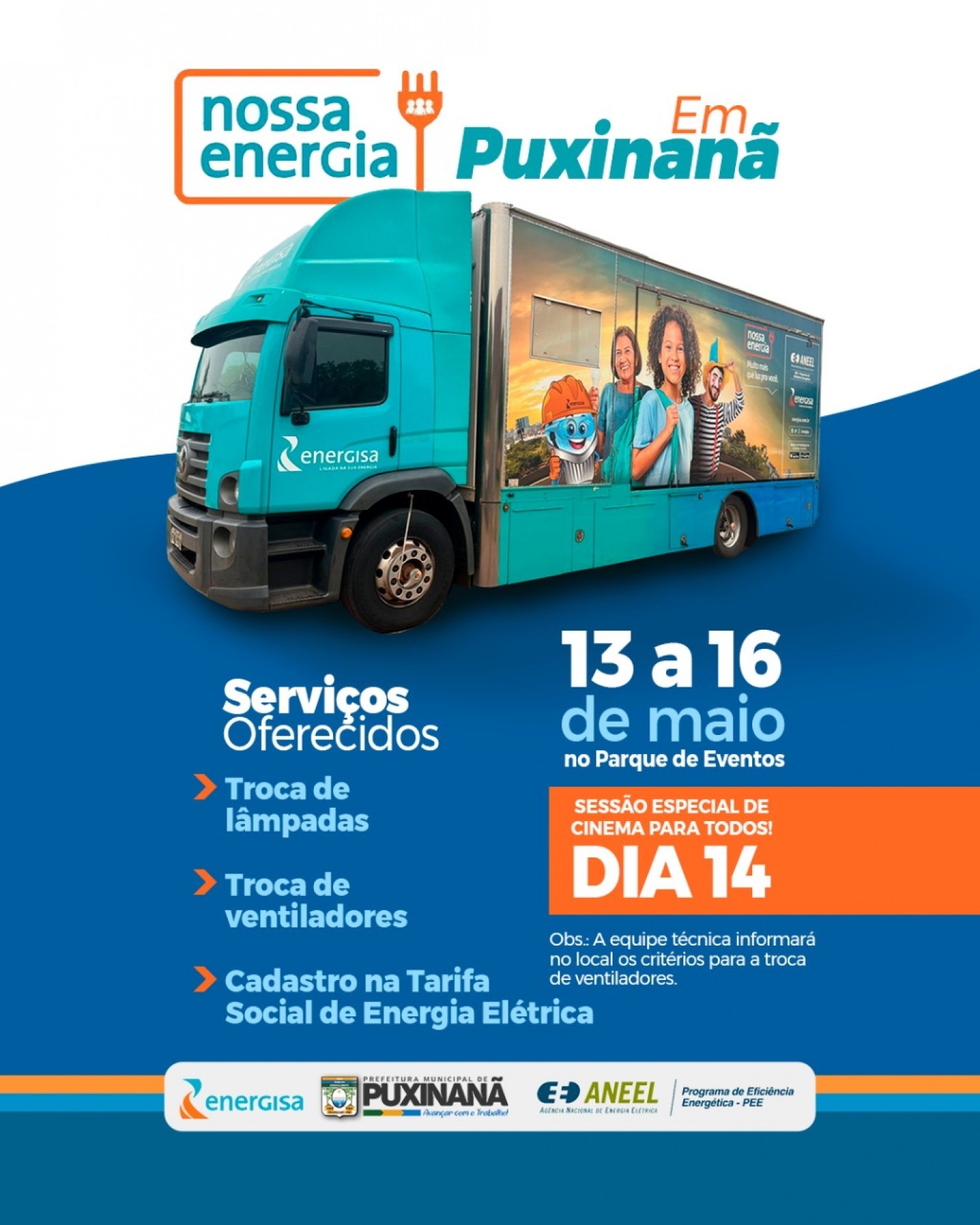 A Prefeitura de Puxinanã, por meio da Secretaria de Assistência Social, em parceria com a   energia promovem entre os dias 13 a 16 de maio, no Parque de Eventos, a ação “Nossa energia”.