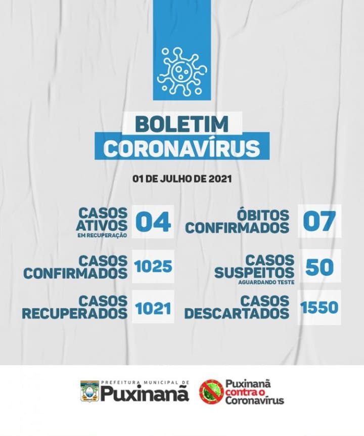 Boletim epidemiológico atualizado, em: 01/07/2021