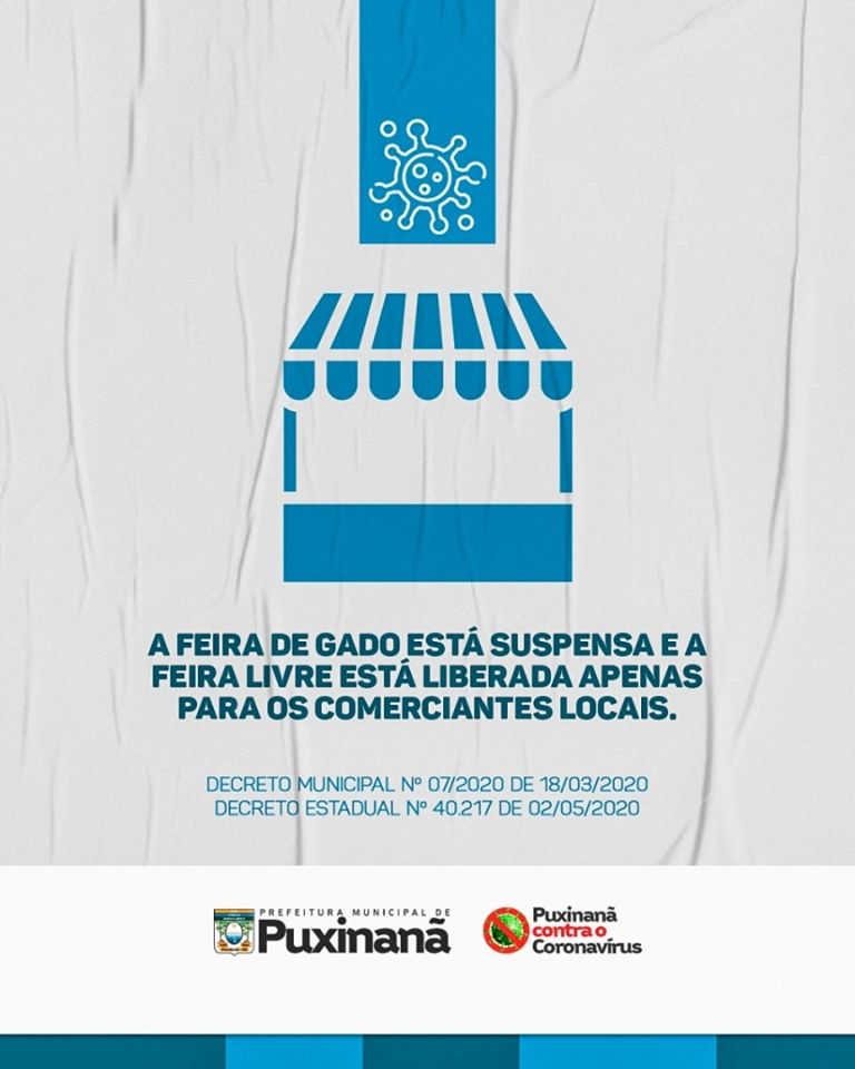 Atenção! Informamos a população que a feira de gado está suspensa e a feira livre está liberada apenas para os comerciantes locais. #PuxinanãContraoCoronavírus