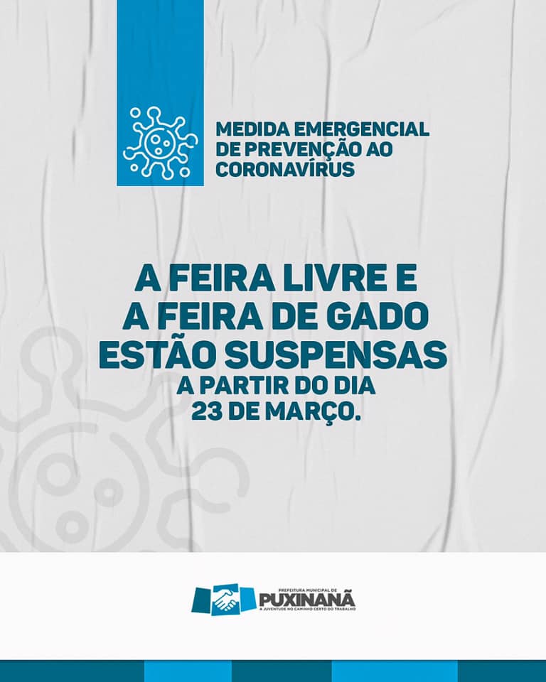 Como medida emergêncial de prevenção a pandemia, a feira livre e a feira de gado foram suspensas por tempo indeterminado, a partir do dia 23/03/2020.
