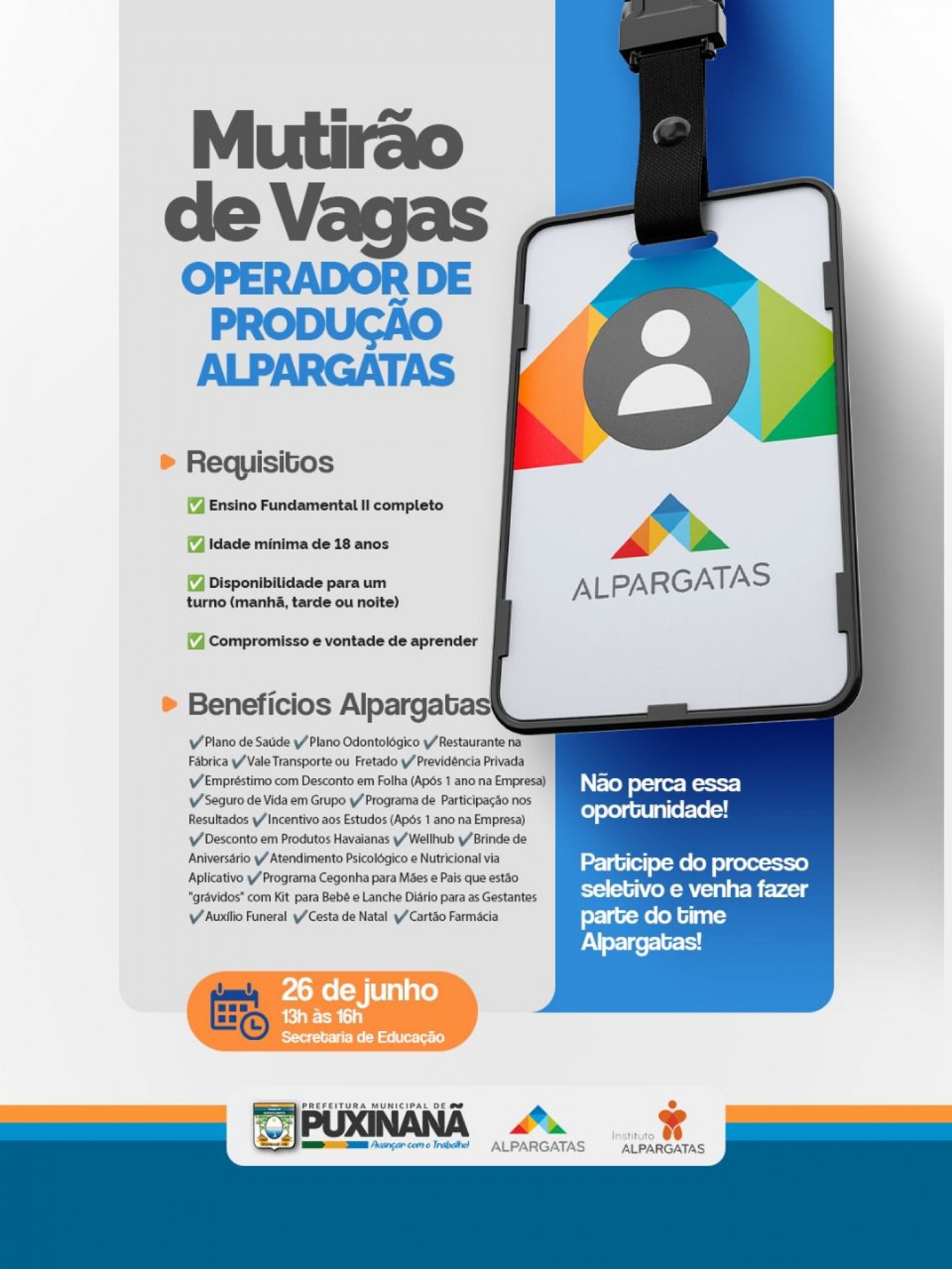 No próximo dia 26 de junho, das 13h às 16h, acontece na Secretaria de Educação o Mutirão de Vagas para Operador de Produção da Alpargatas, em parceria com o Instituto Alpargatas e a Prefeitura Municipal.