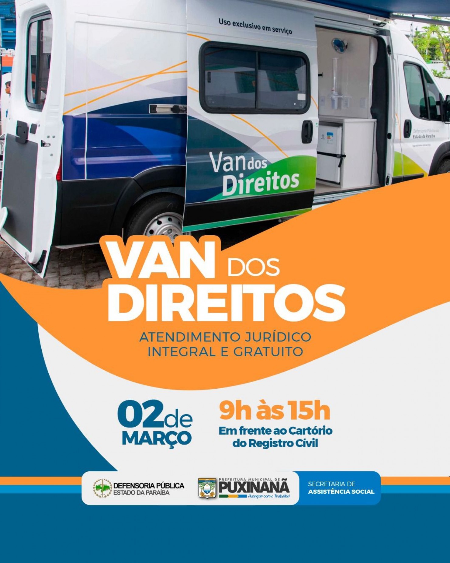 A unidade móvel da "Van dos Direitos" ficará estacionada em frente ao Cartório do Registro Civil, atendendo das 09h às 15h. Serão oferecidos serviços como: divórcio, pensão alimentícia, reconhecimento de paternidade, regularização de visitas, demandas de saúde, entre outros.