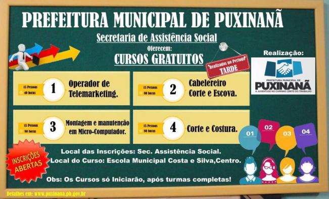 A Prefeitura Municipal de Puxinanã, junto da Secretaria de Assistência Social, está disponibilizando Cursos Profissionalizantes de forma gratuita.