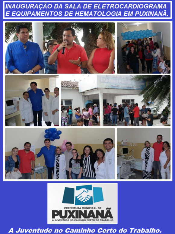 Neste dia 13/09, Puxinanã recebe sala de eletrocardiograma, e novos equipamentos de Hematologia na Maternidade e Policlínica de Puxinanã. A inauguração aconteceu por volta das 10:30 da manhã, Com a presença de autoridades políticas do município, jornalistas, e demais pessoas que vieram prestigiar mais um avanço que se realiza na gestão do Prefeito FELIPE COUTINHO.
