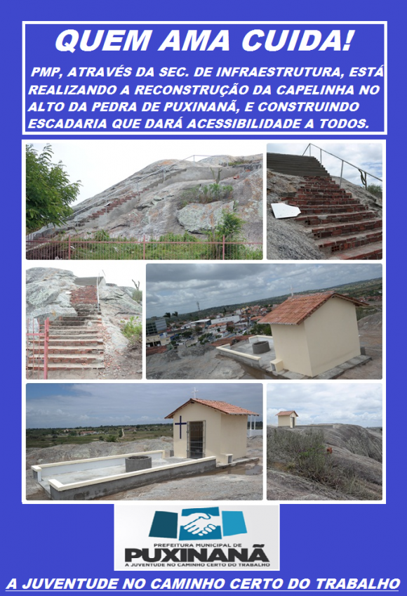 A Prefeitura, através da Secretaria de Infraestrutura, continua a reconstrução da Capelinha no alto da pedra de Puxinanã, e pensando em todos aqueles que desejam visitar este lindo ponto turístico de nossa cidade e não conseguem subir até lá, está sendo construída uma escadaria que dará acessibilidade a todos quanto desejarem visitar a Capelinha, e poderem presenciar a belíssima vista do alto do lajedo da Cidade.