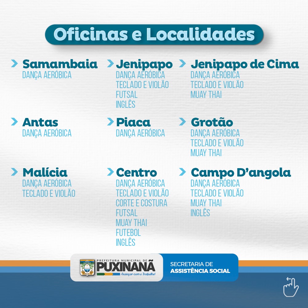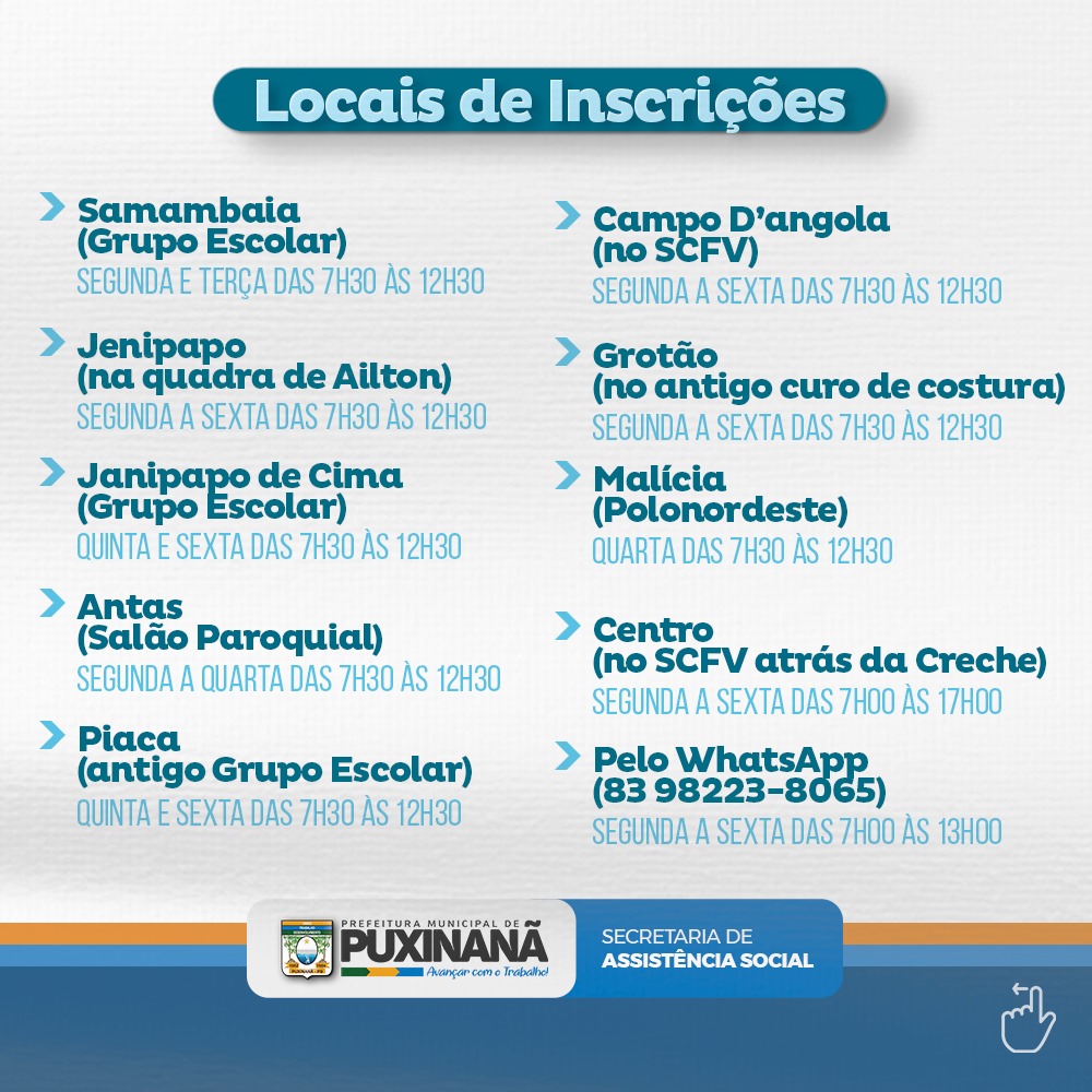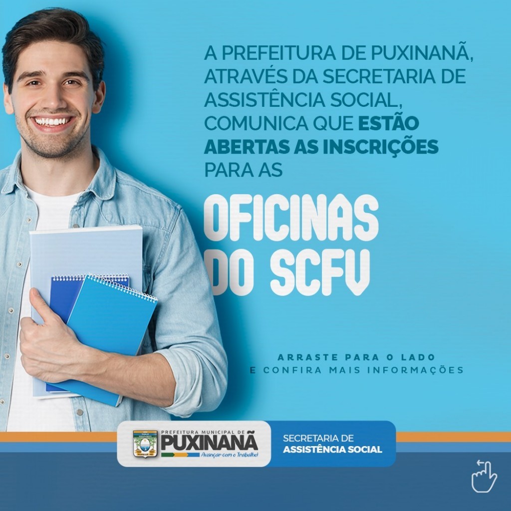 A Prefeitura de Puxinanã, por meio da Secretaria de Assistência Social, informa que estão abertas as inscrições para as oficinas do Serviço de Convivência e Fortalecimento de Vínculos (SCFV). O programa oferece atividades voltadas ao desenvolvimento social e pessoal de crianças, adolescentes e idosos, promovendo a inclusão e o bem-estar da comunidade.