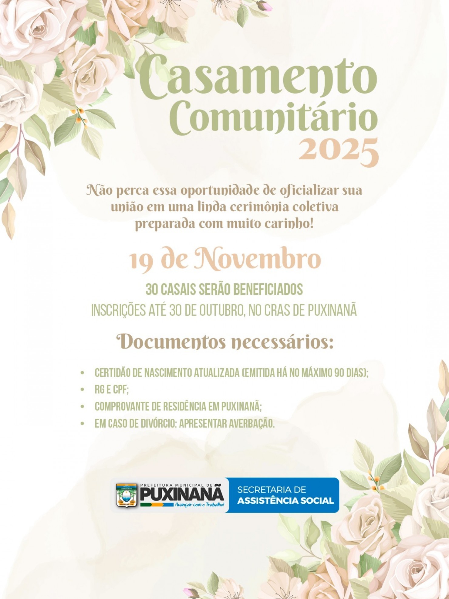 A Prefeitura Municipal de Puxinanã, por meio da Secretaria de Assistência Social, promoverá o Casamento Comunitário 2025, que celebrará a união de 30 casais em uma cerimônia preparada de forma especial.
