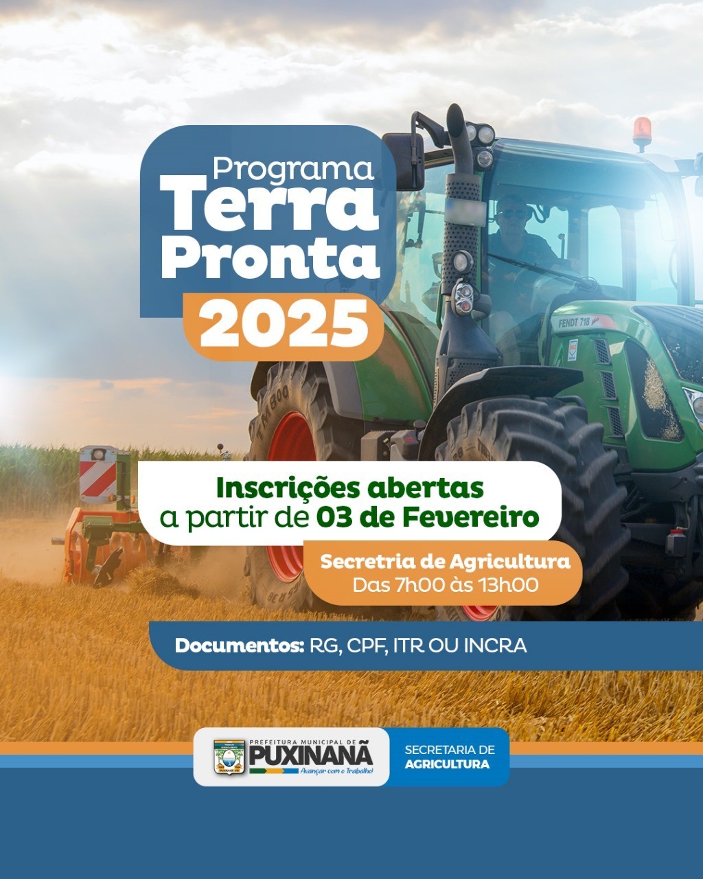 A Prefeitura de Puxinanã, por meio da Secretaria de Agricultura, inicia no próximo dia 3 de fevereiro as inscrições para o corte de terra. O programa tem o objetivo de apoiar os agricultores locais, garantindo melhores condições para o plantio e fortalecendo o desenvolvimento da agricultura no município.