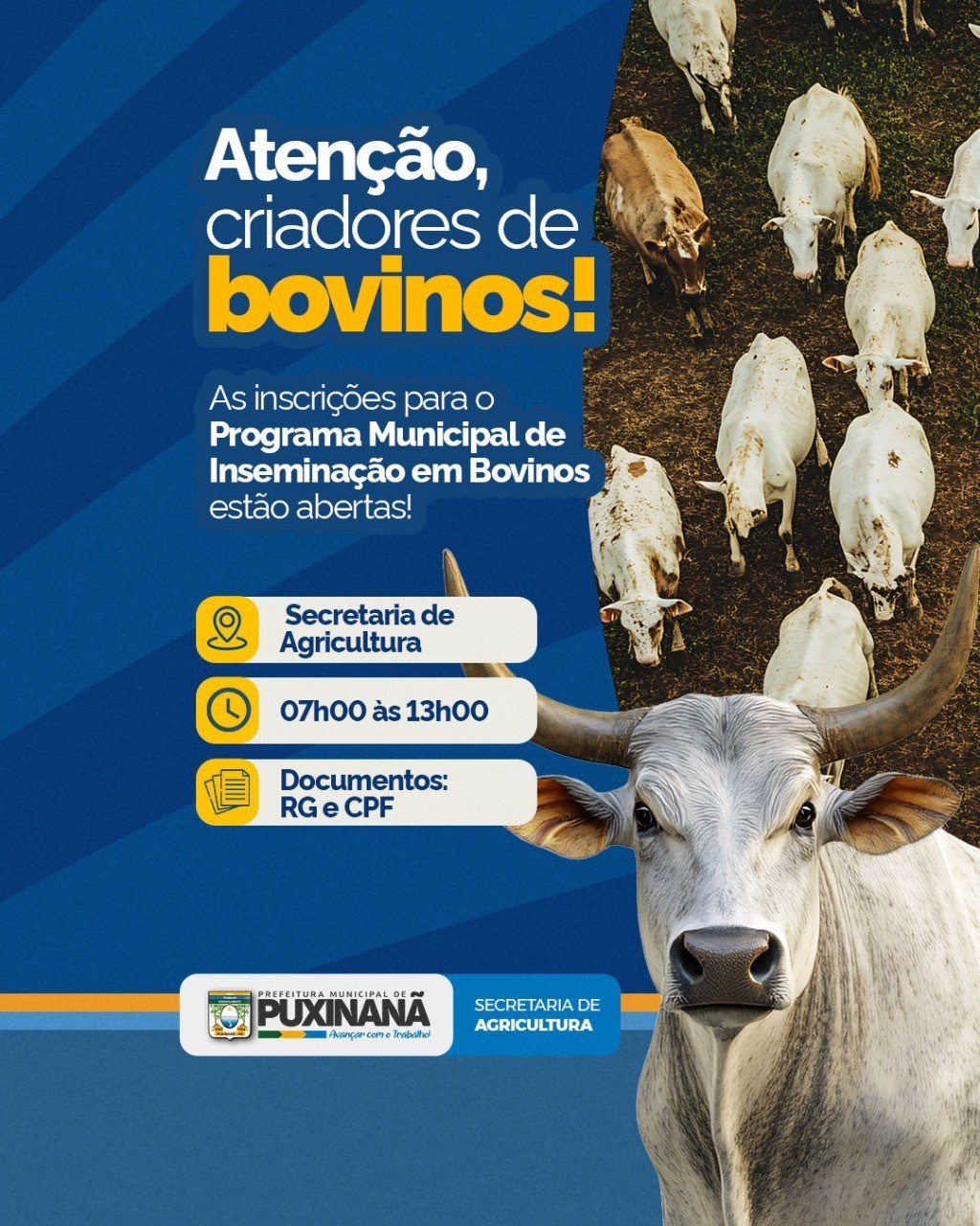 A Prefeitura de Puxinanã, por meio da Secretaria de Agricultura, está com inscrições abertas para o Programa Municipal de Inseminação em Bovinos. A iniciativa busca fortalecer a pecuária local, melhorando a qualidade genética dos rebanhos e aumentando a produtividade dos criadores do município.