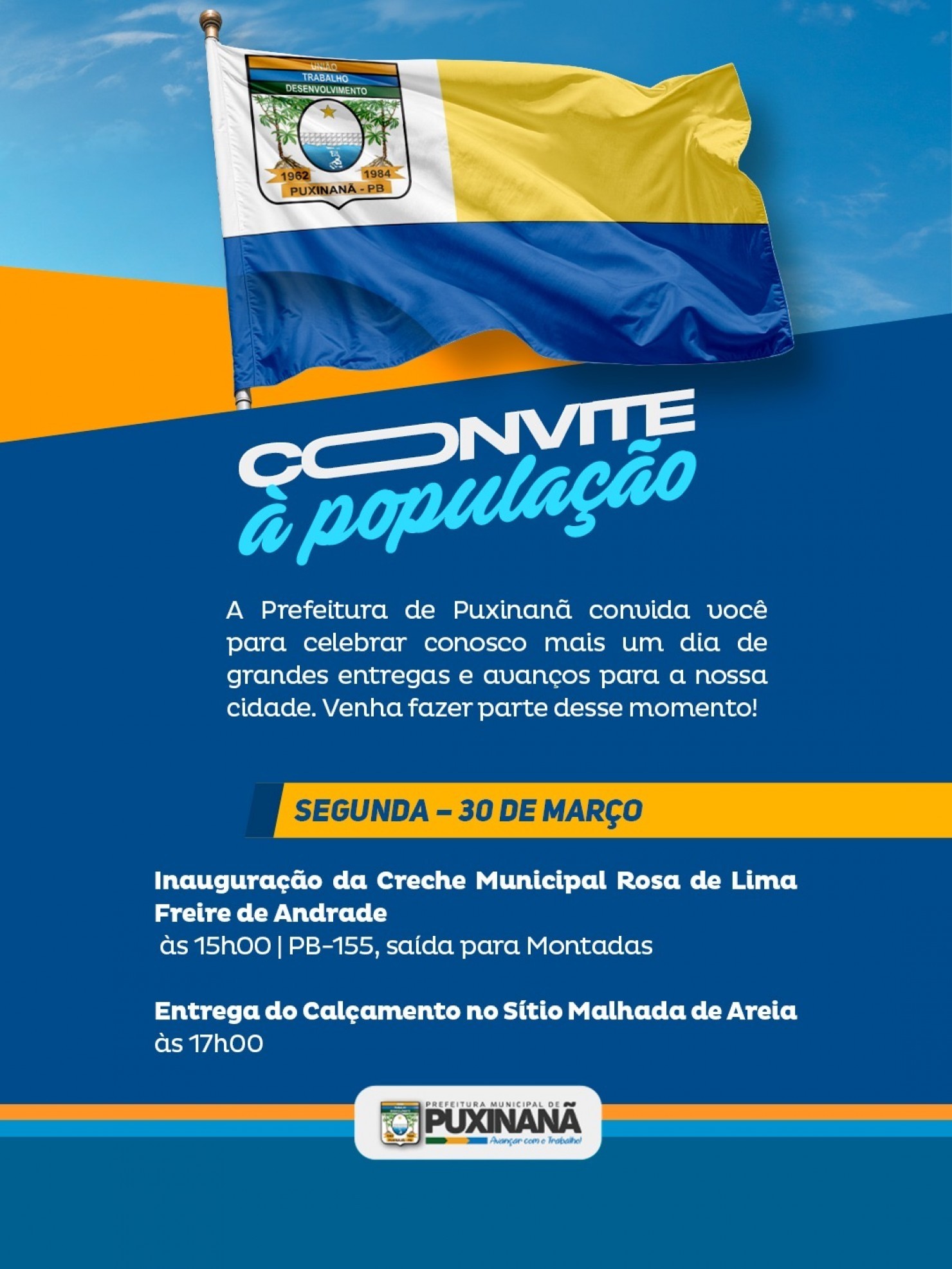 A Prefeitura de Puxinanã reforça que essas conquistas pertencem ao povo e, por isso, convida todos os cidadãos e suas famílias para estarem presentes nestes dois momentos de celebração.