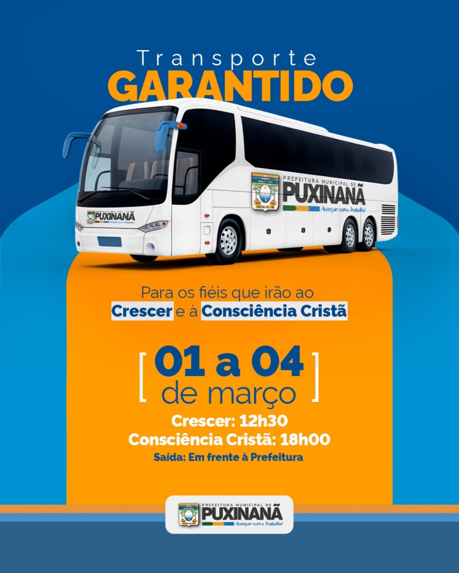 O serviço atenderá os públicos do Crescer e da Consciência Cristã, nos dias 1º, 2, 3 e 4 de março. As saídas acontecerão em frente à Prefeitura, seguindo os seguintes horários: