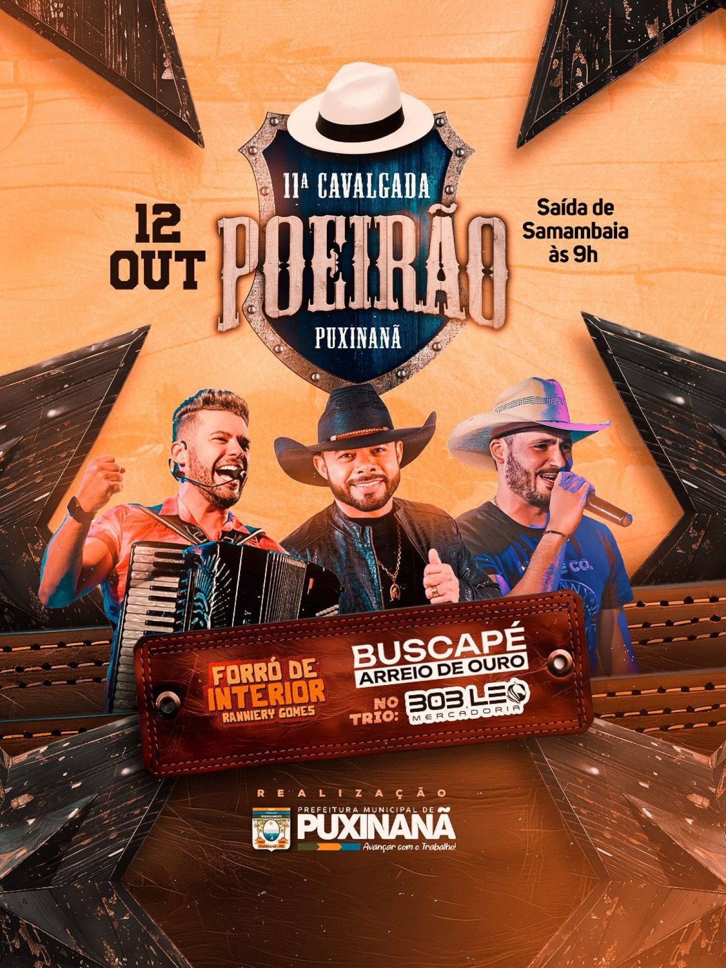 A Prefeitura de Puxinanã divulgou, nesta terça-feira (30), as atrações que irão animar a 11ª Cavalgada Poeirão, evento já tradicional no calendário cultural do município. A cavalgada será realizada no domingo, 12 de outubro, com saída às 9h, de Samambaia.