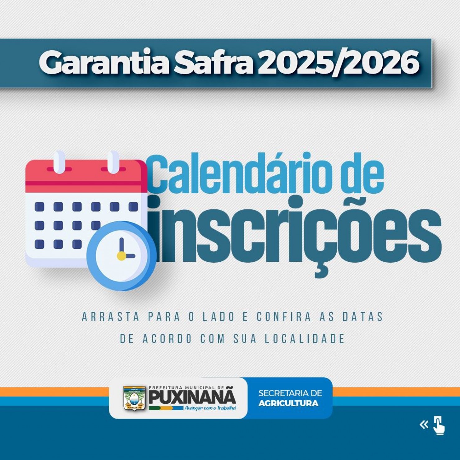 A Prefeitura de Puxinanã, por meio da Secretaria de Agricultura, divulgou o cronograma de inscrições do Programa Garantia-Safra 2025/2026. A iniciativa tem como objetivo assegurar apoio financeiro aos agricultores familiares em caso de perda de safra por causa da seca ou do excesso de chuvas.