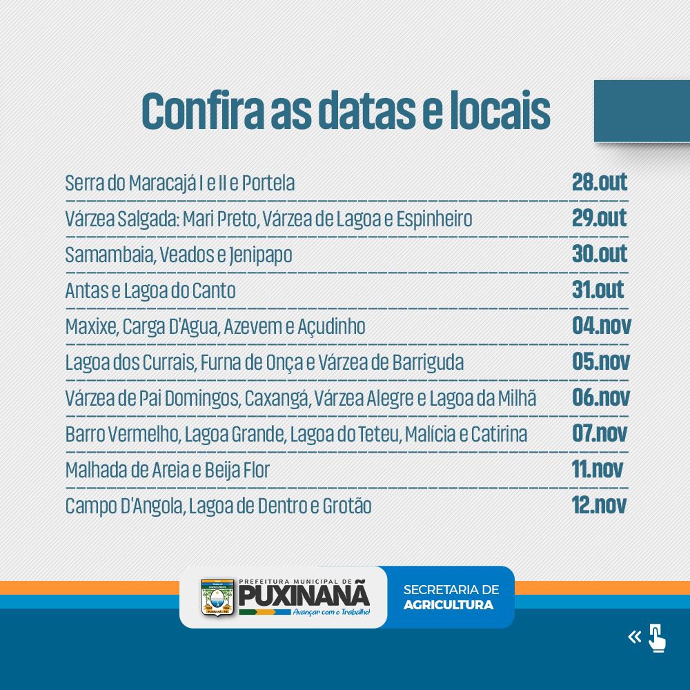As inscrições ocorrerão entre os dias 28 de outubro e 12 de novembro, seguindo um calendário específico por localidade rural. Os atendimentos serão realizados das 8h30 às 11h30, na EMPAER Puxinanã.