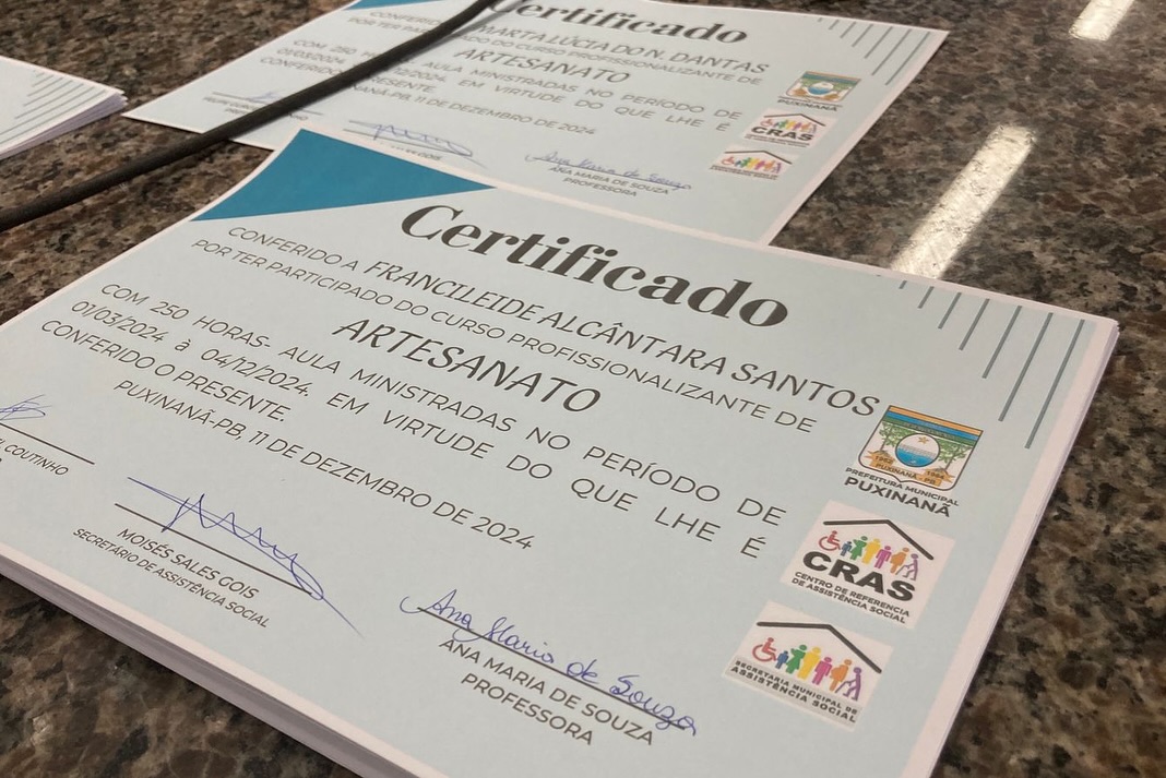 Ontem (11), a Prefeitura de Puxinanã realizou, na Câmara Municipal, a cerimônia de entrega de 3.278 certificados dos cursos de capacitação promovidos pela Secretaria de Assistência Social, em parceria com o CRAS e o Serviço de Convivência e Fortalecimento de Vínculos (SCFV).