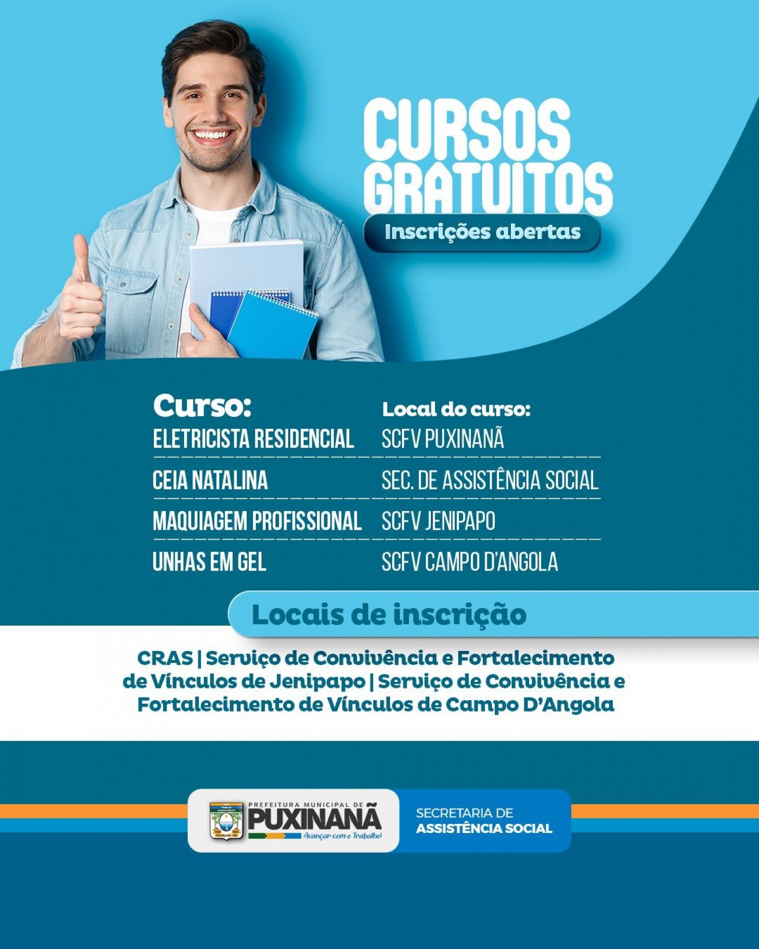 A Prefeitura de Puxinanã, por meio da Secretaria de Assistência Social, está com inscrições abertas para cursos gratuitos voltados à qualificação profissional e geração de renda. As capacitações incluem as formações em eletricista residencial, ceia natalina, maquiagem profissional e unhas em gel.
