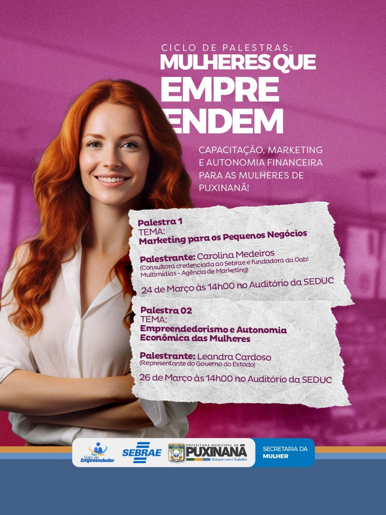 A Prefeitura Municipal de Puxinanã, através da Secretaria da Mulher, realizará na próxima semana um Ciclo de Palestras dedicado ao empreendedorismo feminino. Os encontros, que visam capacitar, inspirar e fortalecer os negócios liderados por mulheres no município, acontecerão no auditório da Secretaria de Educação (SEDUC).