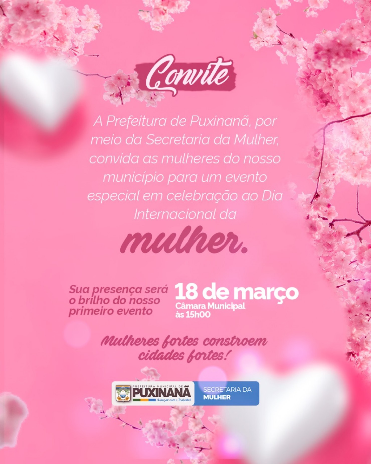 A Prefeitura de Puxinanã, por meio da Secretaria da Mulher, promove no próximo dia 18 de março, um evento especial em celebração ao Dia Internacional da Mulher. A programação será realizada na Câmara Municipal, a partir das 15h, e reunirá as mulheres do município para um momento de reconhecimento, valorização e fortalecimento feminino.