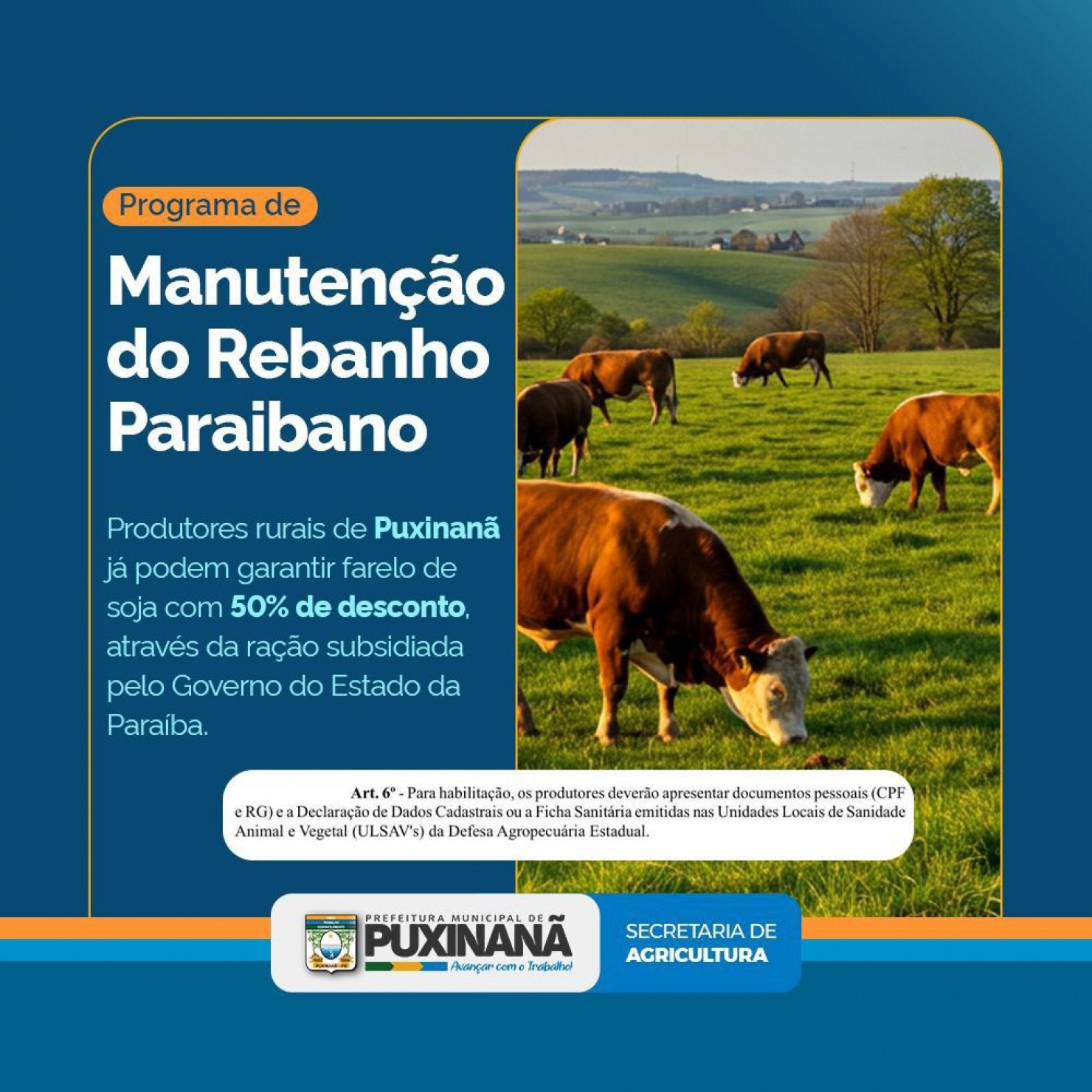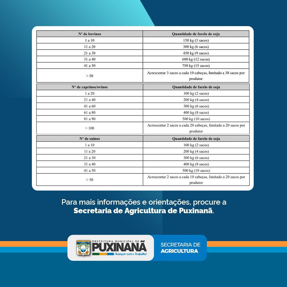 A Secretaria de Agricultura de Puxinanã informa que já está em andamento o Programa de Manutenção do Rebanho Paraibano, uma iniciativa do Governo do Estado que oferece 50% de desconto na compra do farelo de soja destinado à alimentação animal. O benefício tem como objetivo auxiliar os produtores rurais, garantindo a continuidade da produção e a sustentabilidade dos rebanhos.