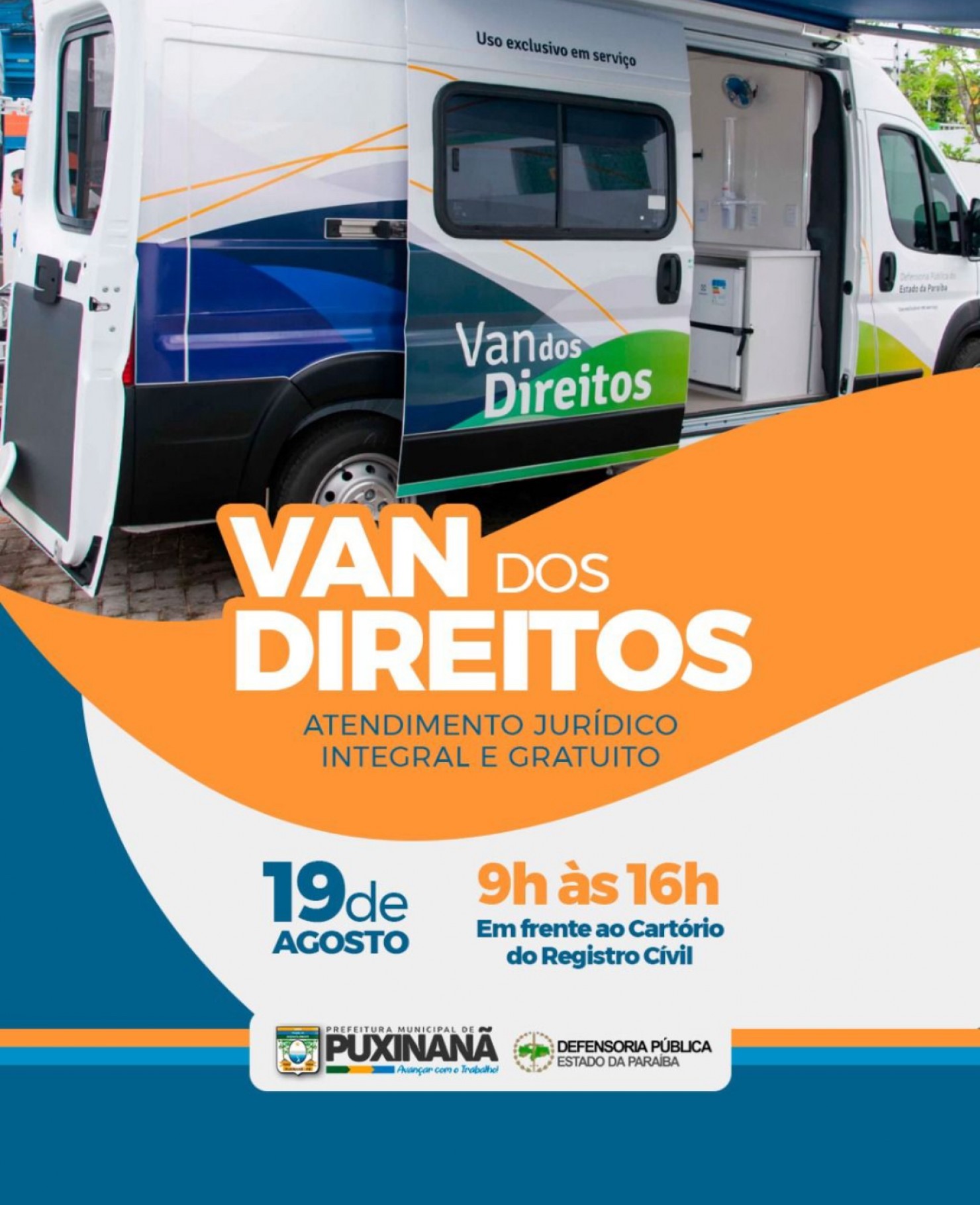 No próximo dia 19 de agosto, nosso município vai receber a Van dos Direitos, um serviço da Defensoria Pública da Paraíba que oferece atendimento público integral e gratuito para a população.