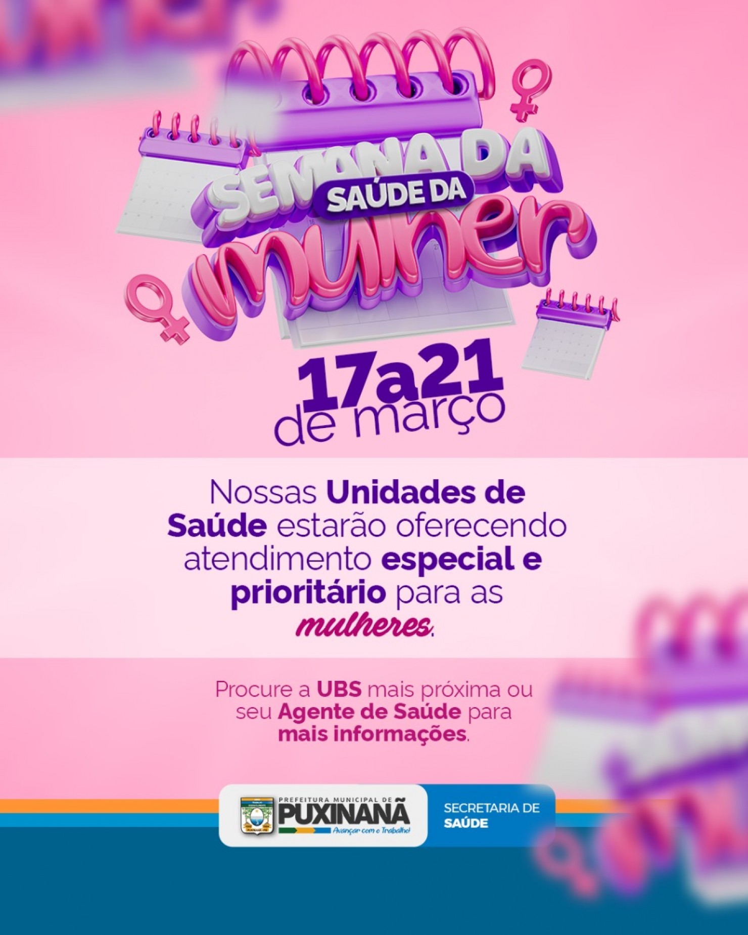 A Prefeitura de Puxinanã, por meio da Secretaria de Saúde, realiza entre os dias 17 e 21 de março a Semana da Saúde da Mulher, uma iniciativa voltada ao cuidado e bem-estar feminino. Durante esse período, as Unidades Básicas de Saúde (UBS) oferecerão atendimento especial e prioritário para as mulheres do município.